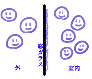 窓ガラスが外の空気に冷やされて冷たくなっている状態に室内の空気がふれます。外の冷たい空気に冷やされて室内の窓際の空気も冷やされ暖かい空気に含まれる水蒸気が溶け込めなくなり窓ガラスに水滴として現れます。