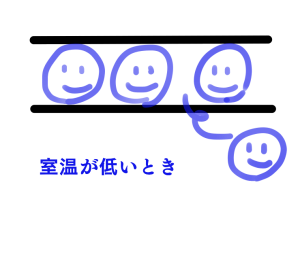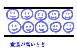 室内の水蒸気量が多い場合に発生すます。ここでいう水蒸気量とは外気と比べて室内のほうが温度が高いとき湿度計が外気と同じであっても、じつは室内のほうが水蒸気量が多いことに注意してほしいので図で説明します。